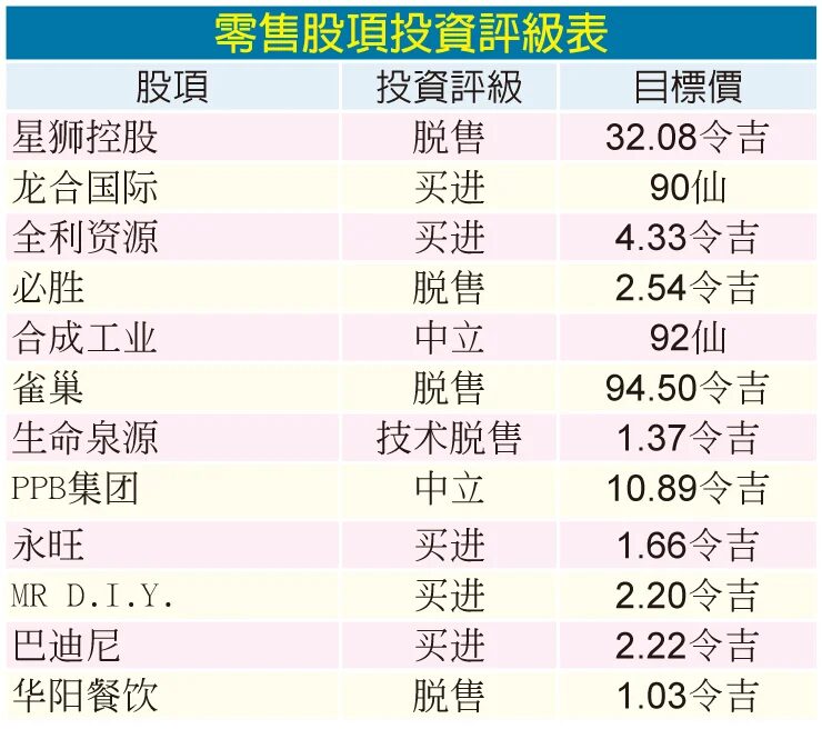投资者对零售及快速消费品市场兴趣浓厚。MR D.I.Y.因广泛的零售网络和低采购成本在市场上具备竞争优势;永旺则受益于稳定的商场人流和物业管理收入;龙合国际因主食蛋白质需求持续以及饲料成本可控,被视为相对稳健的投资选择。这些企业的表现成为零售板块投资机会的重要参考。